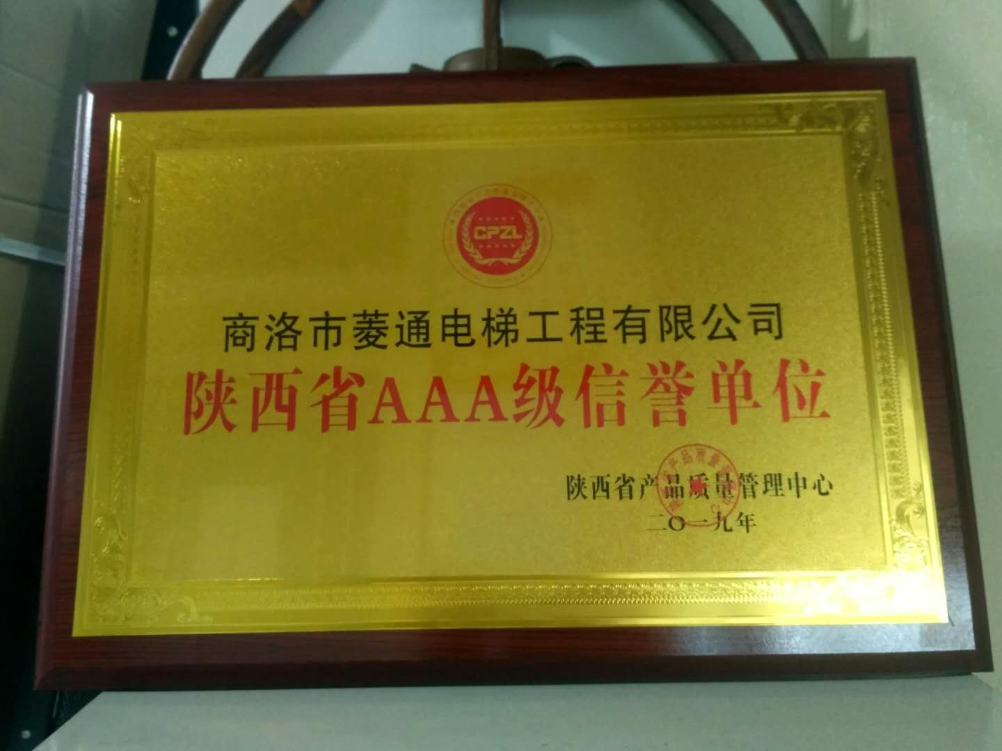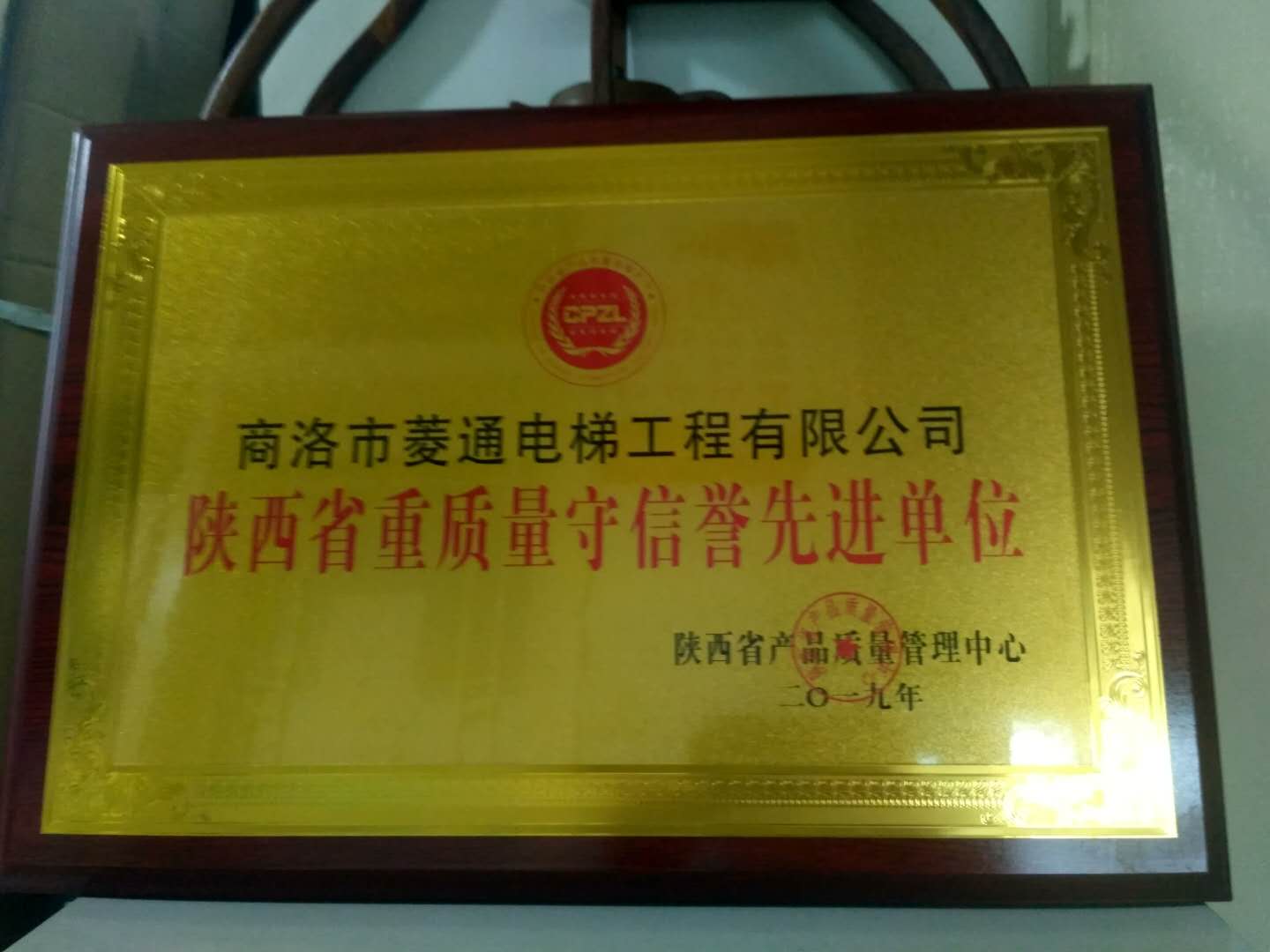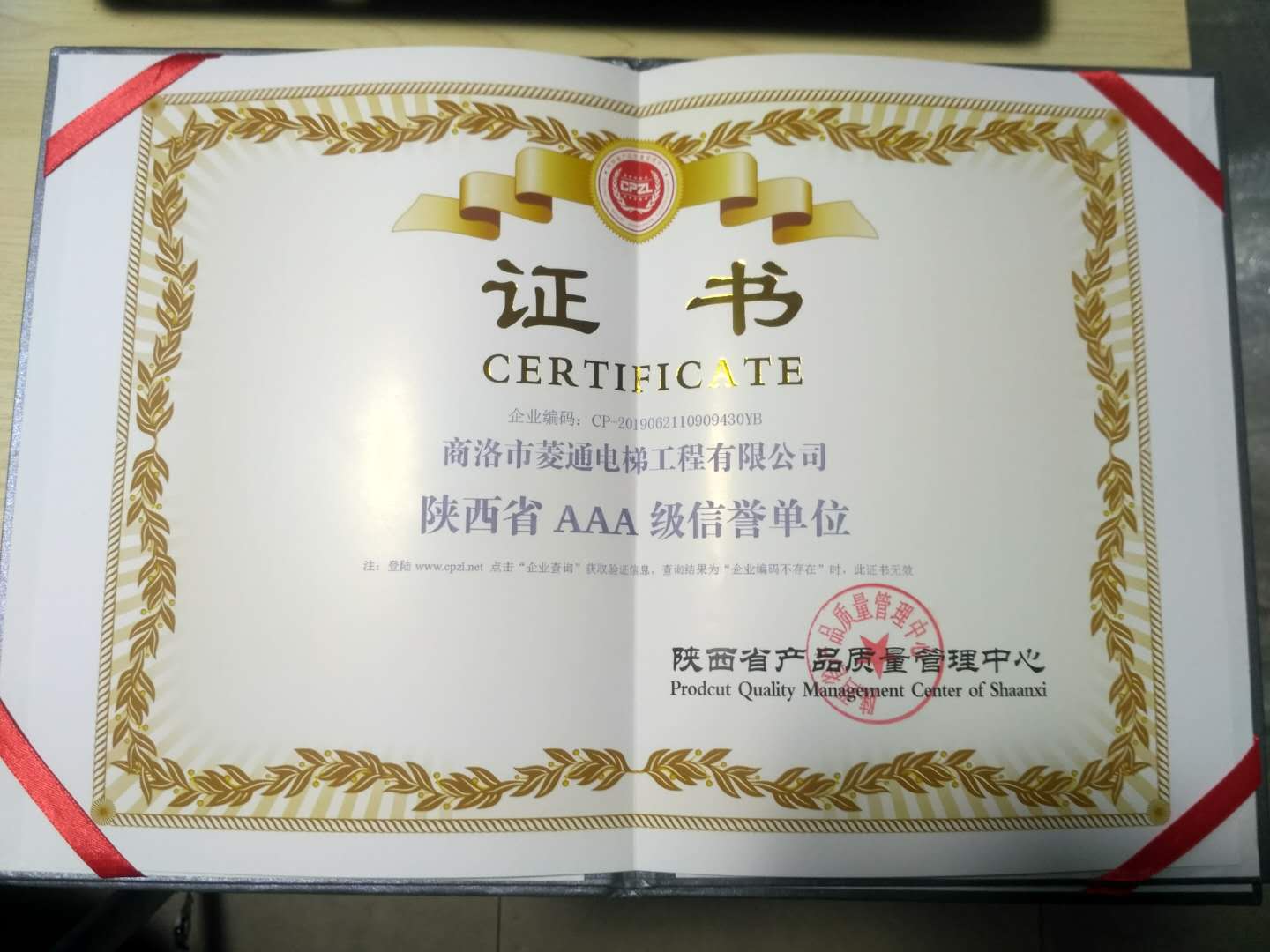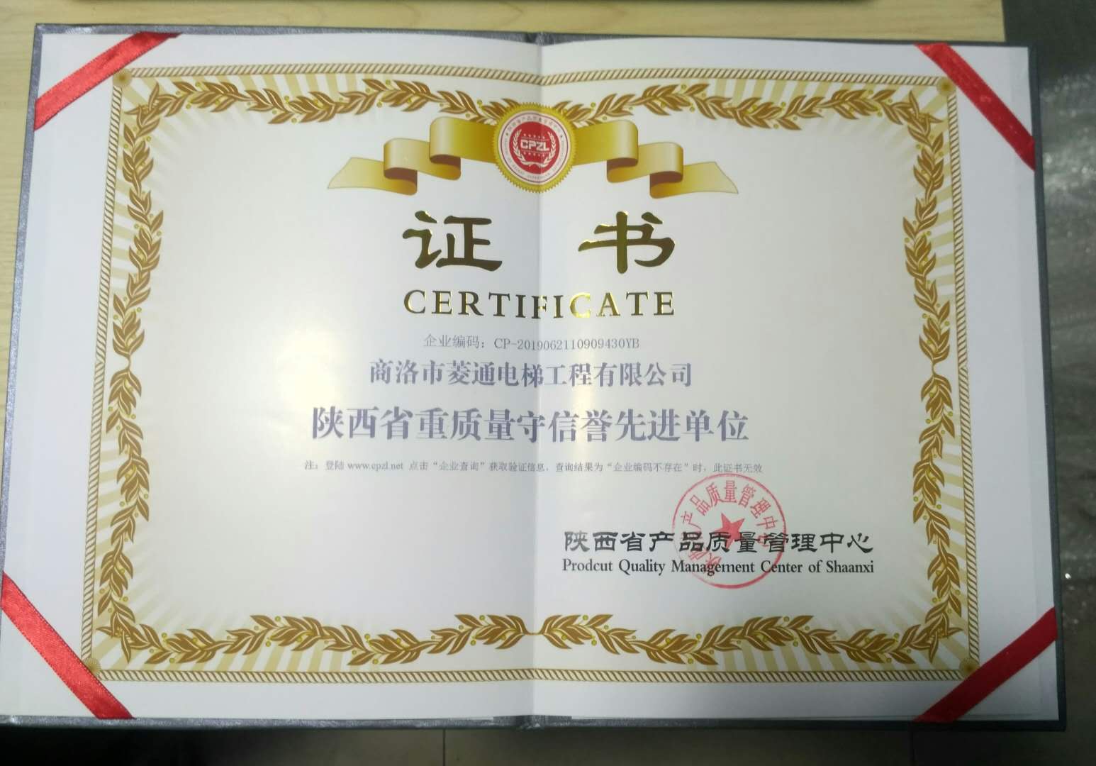 商洛菱通電梯工程有限公司,2019年很榮幸被陜西省產(chǎn)品質(zhì)量管理中心評(píng)為:陜西省AAA級(jí)信譽(yù)單位和陜西省重質(zhì)量守信譽(yù)先進(jìn)單位;并頒發(fā)獎(jiǎng)牌及榮譽(yù)證書(shū)。這個(gè)榮譽(yù)不但得益于各單位的支持與默契合作,更得益于我公司優(yōu)良的團(tuán)隊(duì)氛圍和集體上下一致積極認(rèn)真的工作態(tài)度。更得益于領(lǐng)導(dǎo)重承諾守信譽(yù):提倡安全第一,質(zhì)量第一,信譽(yù)第一的原則。能被評(píng)為3A級(jí)信譽(yù)單位和信譽(yù)先進(jìn)單位,既是對(duì)公司工作的肯定,也是對(duì)今后工作做得更好的一種鼓勵(lì),我公司定會(huì)盡職盡責(zé)做得更好。