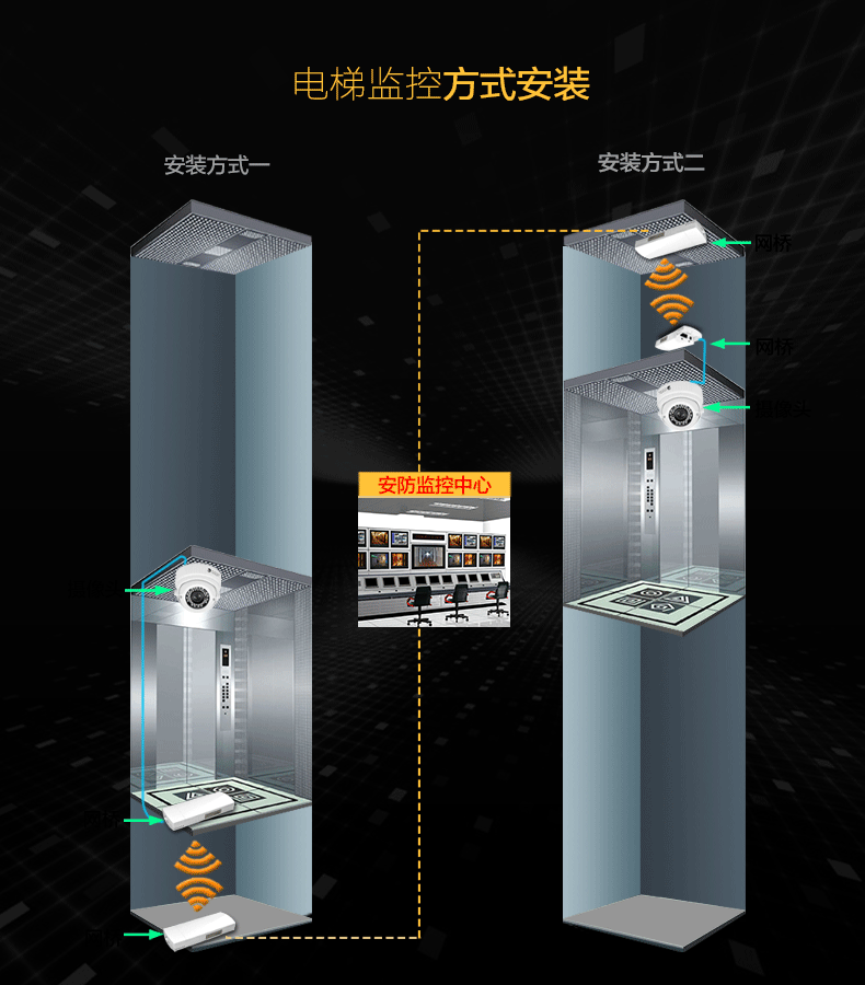電梯內(nèi)底部已全部封閉,無(wú)法使用就近光纖節(jié)點(diǎn)對(duì)電梯視頻數(shù)據(jù)做傳輸,而電梯頂部留有電梯線纜口。這種情況下利用電梯轎廂與頂部的空隙空間,在電梯轎廂頂部安裝1臺(tái)專用無(wú)線網(wǎng)橋與電梯線纜口安裝的1臺(tái)電梯專用無(wú)線網(wǎng)橋進(jìn)行數(shù)據(jù)傳輸,通過網(wǎng)線使用交換機(jī)把各電梯的視頻數(shù)據(jù)集中,最后通過豎井使用網(wǎng)線或者在樓層頂!使用一對(duì)電梯專用網(wǎng)橋,把集中的視頻數(shù)據(jù)傳回機(jī)房,通過硬盤錄像機(jī)在大屏上顯示,整套方案,安裝簡(jiǎn)單,施工工期短,便于后期問題的排查,維護(hù)。