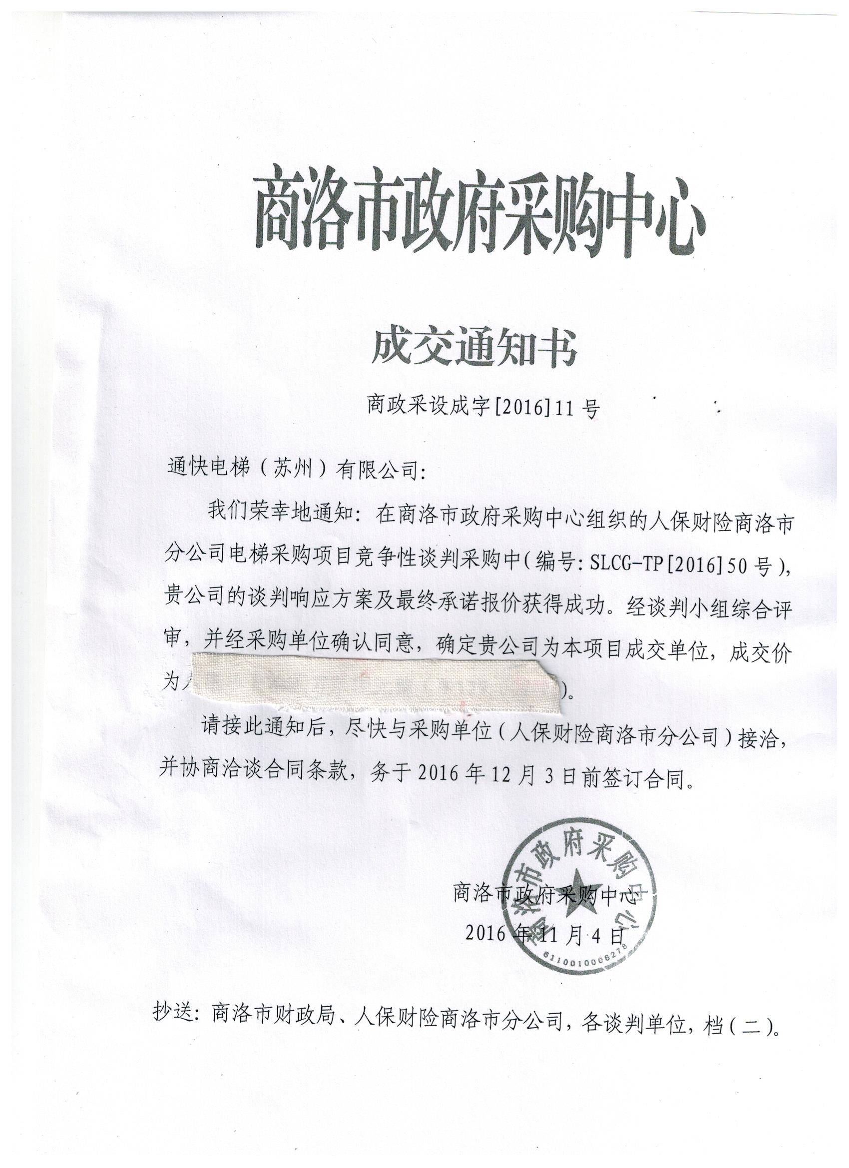 通快電梯(蘇州)有限公司中標人保財險商洛分公司電梯項目