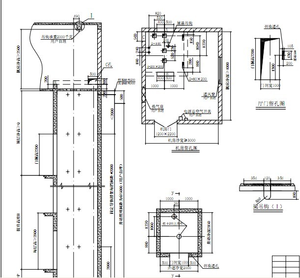 三是平衡錘的位置和一般與電梯機(jī)房的拓展方向有關(guān)。四是要注意機(jī)房地面的留洞和頂面的吊鉤,還有機(jī)房門的凈寬要求和通路要求。